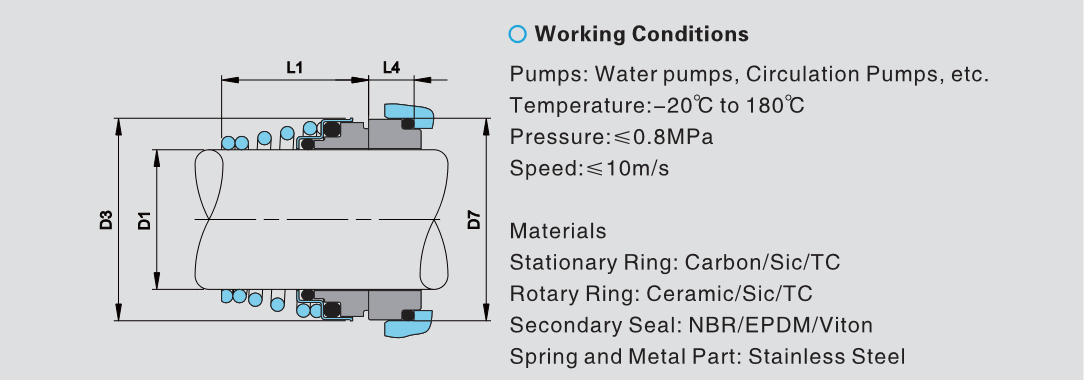 產(chǎn)品說明:材料: 靜環(huán):Carbon/ Sic/ TC 動環(huán):Ceramic/ Sic/ TC 輔助密封:NBR/ EPDM/ Viton 彈簧及金屬件:不銹鋼